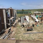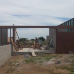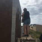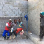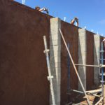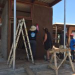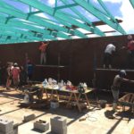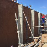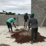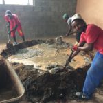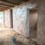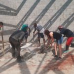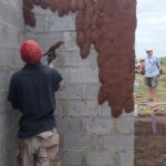 Während ein Teil unserer Gruppe mit den Holzarbeiten für das Dach beginnt, verputzen unsere „locals“ bereits die ersten Innenwände! Jeder und jede von uns darf dabei mithelfen! Für die Putzmischung werden Sand, Zement und Wasser auf die große Betonfläche in der „Hall“ gebracht und dort mit Schaufeln vermischt! Eine tolle Technik und faszinierend dabei zuzusehen! Anschließend wird der rot-braune Putz auf die Wände aufgebracht und nach kurzer Trocknungszeit zu dicke Putzstärken mit einer Alulatte abgekratzt. Danach wird die Oberfläche mit dem Pinsel wieder befeuchtet, mit dem Reibbrett verrieben und mit dem Schwamm abgezogen! Fertig ist die Putzoberfläche! // While some of our group start with the woodwork for the roof, our locals are already plastering the first interior walls! Each one of us is allowed to help! For the plaster mixture sand, cement and water are brought to the large concrete surface in the hall and mixed there with shovels! A great technique and fascinating to watch! Then the red-brown plaster is applied to the walls and after a short drying time too thick plaster thicknesses are scraped off with an aluminum mat. Then the surface is softly moistened with a brush, rubbed with a rubbing board and peeled off with a sponge! Done is the plaster surface!